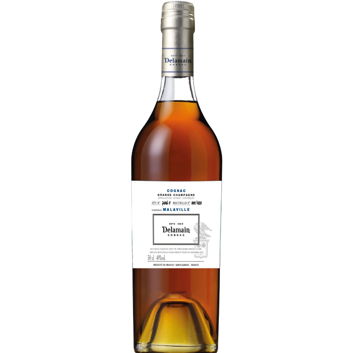 Ce cognac est issu d'un vignoble situé à Malaville, un terroir reconnu pour la qualité et la richesse des eaux-de-vie qui y sont produites. Après un long vieillissement en vieux fûts de chêne de 350 L, les qualités de ce cognac ont été jugées si singulières que nous avons décidé de mettre ce fût en bouteilles sans assemblage, ni réduction (à 49%). Nez : Arômes d'abricot, de poire, d'amande en poudre, puis de sous-bois et enfin de cuir. Bouche : On déguste des notes de fruits mûrs, de cassis, de confiture de mirabelle, puis des noix de cacao.