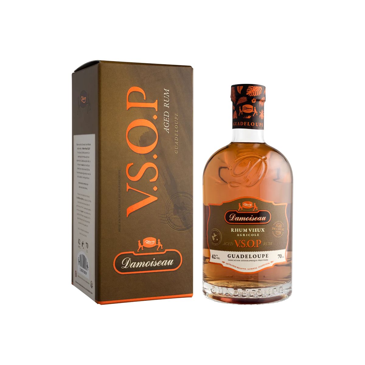 Le rhum ambré vieux VSOP Damoiseau est issu de la fermentation et de la distillation en colonne créole du pur jus de canne à sucre, récoltées en Grande-Terre, puis vieilli durant au moins 4 années en fûts de chêne, sous les tropiques.